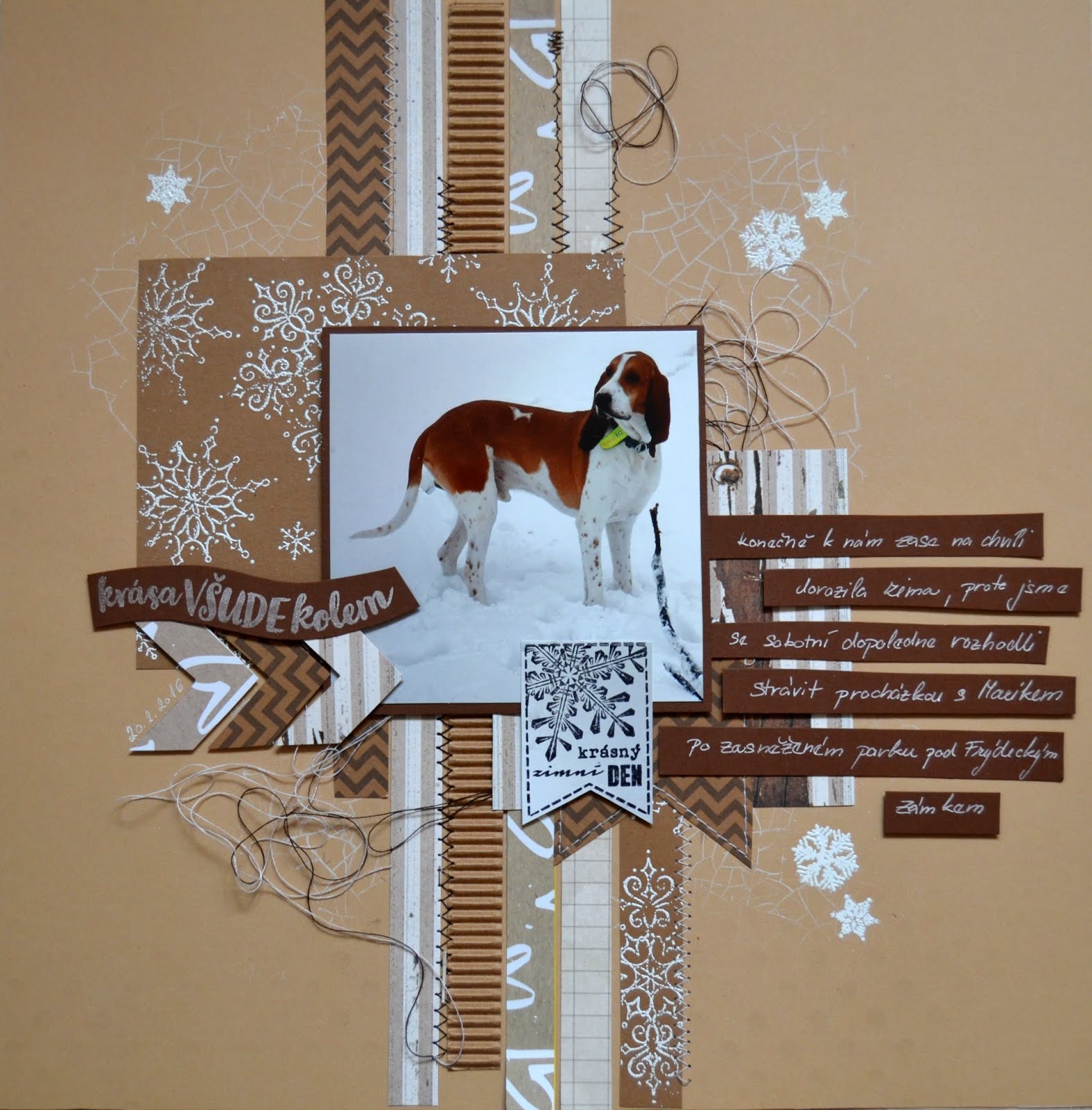 Čím víc jsem kolem fotky chodila, tím víc ve mně narůstal pocit, že bych měla celou stránku barevně sladit s Maxem, ale přesto zachovat malinko i tu sněhovou atmosféru, možná i proto, že letošní zima byla na sníh skoupá a tak si to zasloužilo zaznamenat. Bylo rozhodnuto, stránka bude hnědá dozdobena vločkami.